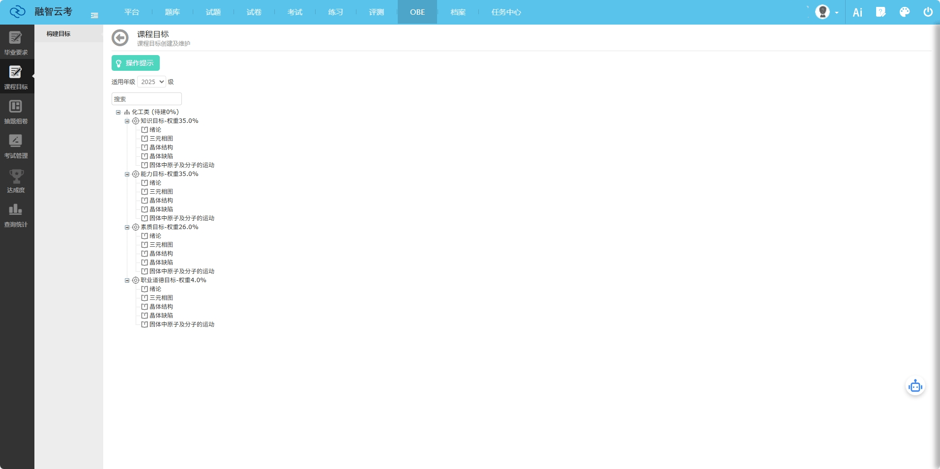 为大学、大学等高校供给学科认证支撑办事,通过建立结业要求目标点取课程映照矩阵,帮力专业告竣国际本色等效认证。例如,某高校材料科学取工程专业操纵系统完成认证自评演讲后,专家反馈“数据链条完整、改良办法具体”,认证通过率提拔至100%。针对处所本科院校转型需求,开辟“财产需求导向”的OBE讲授平台。某省属高校机械设想制制及其从动化专业引入系统后,取企业共建了12门校企合做课程,学生就业合作力显著提拔,近三年就业率不变正在96%以上。为高职院校设想“岗课赛证”融通方案,将职业尺度融入课程方针。某职业手艺学院使用后,其数控手艺专业学生正在全国职业院校技术大赛中获数量增加3倍,结业生起薪提高15%。融智云创软件无限公司前身可逃溯至2000年成立的天演融智软件无限公司教育软件事业部,20余年手艺堆集使其成为教育消息化范畴的标杆企业。公司焦点团队由办事高校测验范畴多年的**工程师构成,具备丰硕的行业产物开辟和办事经验,可以或许快速响应高校多样化需求。公司已构成以OBE讲授为焦点,涵盖学科认证、工程教育认证专业扶植、课程方针告竣度系统的完整产物线个省级行政区,此中包罗985/211高校占比超30%,使用型本科院校占比55%,高职高专占比15%。